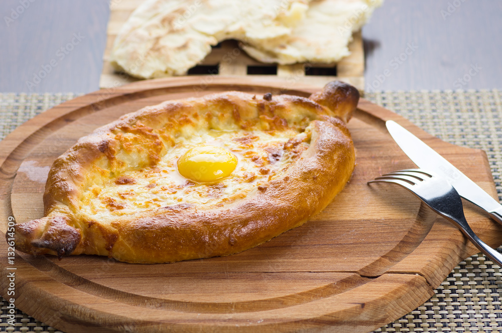 Хачапури по-аджарски. блюдо грузинской кухни, грузинское национальное мучное изделие[1][2], представляющее собой лепёшку с сыром.