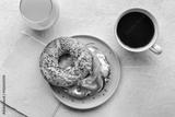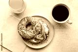 Lox bagel. A breakfast of a sandwich with smoked salmon and fresh vegetables on a plate, with orange juice and coffee, shot from the top