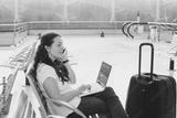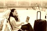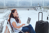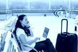 woman in airport talking by phone and checking emails on laptop, business travel, mobile wifi connection