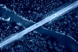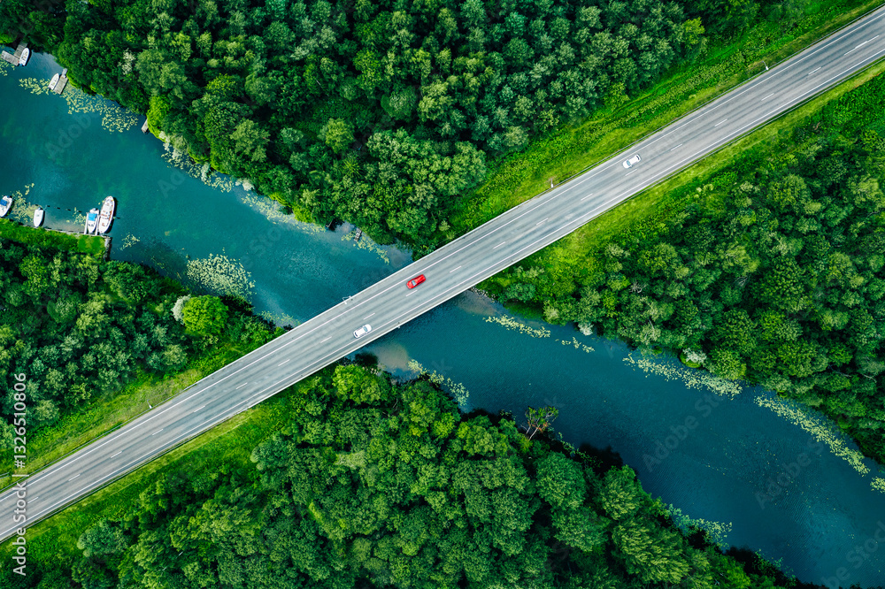 Aerial view of asphalt road with white and red cars over blue river and green summer woods in Finland, drone photography
