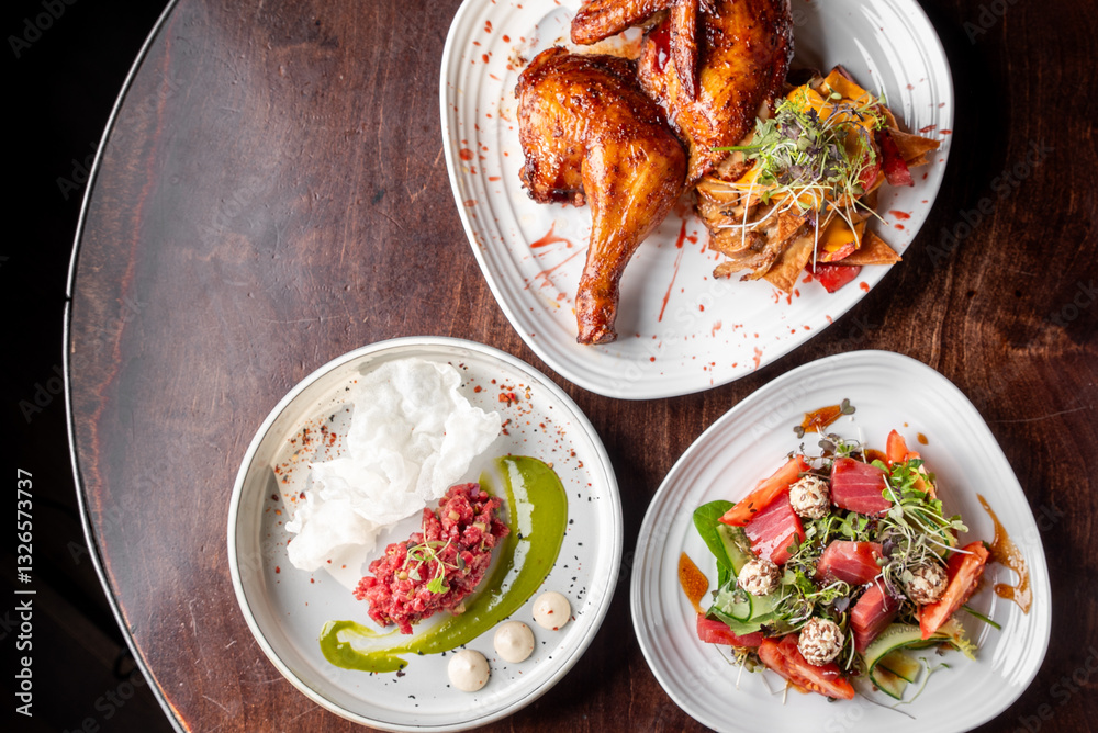 A beautifully plated assortment of gourmet dishes featuring grilled chicken, a fresh salad, and a creative tartare, served on elegant white plates against a rustic wooden table.
