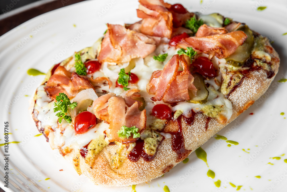 A delicious gourmet pizza topped with slices of ham, cherry tomatoes, pickles, and herbs, drizzled with pesto sauce on a white plate. Perfect for food lovers.