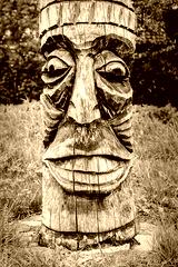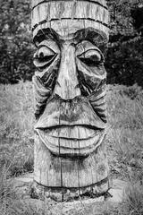 Wooden carving face on totem pole, Indian Museum, Poland.