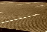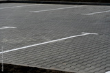 An empty parking lot features neatly arranged vehicle spaces on concrete cobblestones, with a gray cloudy sky above and grass along the edges