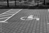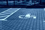 A public parking area features a brightly marked accessible space with blue paving tiles and a clear wheelchair symbol for ease of identification