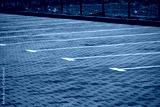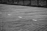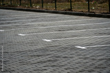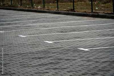 Empty parking lot featuring numerous vacant spaces lined with white markings, set against a backdrop of gray clouds in an urban area