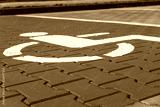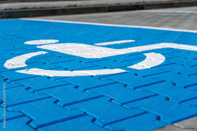 A clearly marked accessible parking space with a blue background and white symbol is visible on the paving tiles during the afternoon