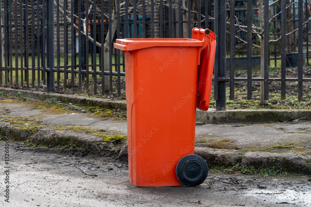A bright orange trash bin stands alone on a gravel path, surrounded by a metal fence and scattered greenery, highlighting urban waste management
