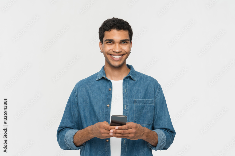 Happy cool curly African American teen guy model wearing casual holding cell phone using mobile digital apps on cellphone tech texting on smartphone isolated on light white background.