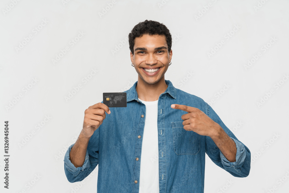 Young smiling happy fun man of African American ethnicity 20s wearing casual hold in hand point index finger on credit bank card isolated on plain pastel light white background studio portrait.