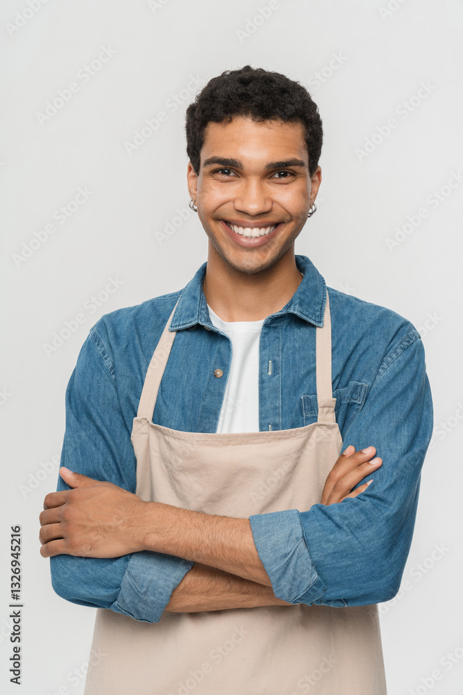 Vertical shot of young guy african american waiter barista barman in apron on a white isolated background, worker in uniform, portrait of service man copy space looking at camera smiling