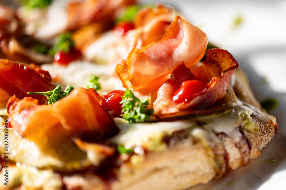 A close-up view of a delicious pizza topped with crispy bacon, fresh herbs, and a drizzle of sauce, showcasing vibrant colors and appetizing textures.