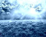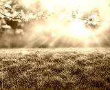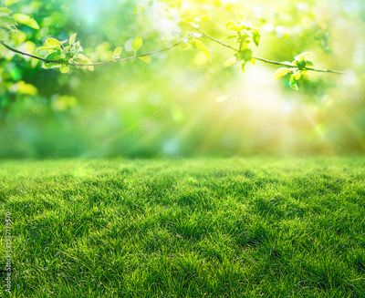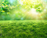 natural grass lawb with blurred bokeh and sun rays, Easter spring background