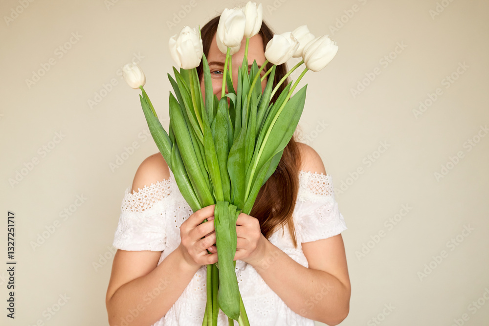 A woman is cheerfully holding a bouquet of white tulips close to her face in a softly lit room. Her bright smile suggests happiness and warmth. Beautiful green leaves accentuate the flowers