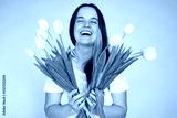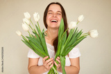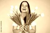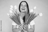 A woman stands in a bright indoor setting, holding bouquets of white tulips. She smiles widely, radiating joy and connection to nature. Her attire features a casual white top
