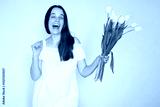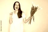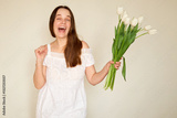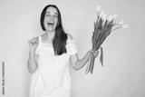 A young woman with long hair smiles brightly while holding a bouquet of white tulips. She is dressed in a casual white dress, exuding happiness in a simple setting