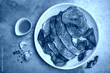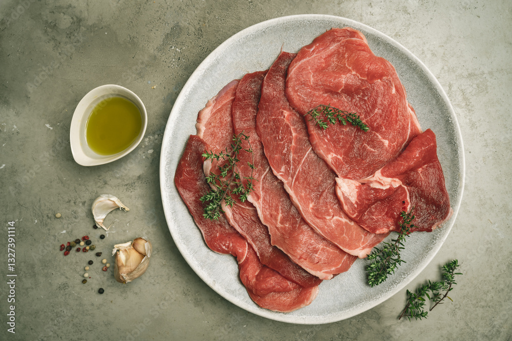Raw organic steak with ingredients for cooking on a gray background. Top view with copy space. High quality photo