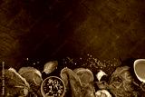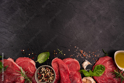 Raw organic steak with ingredients for cooking on a dark slate, stone or concrete background. Top view with copy space. High quality photo