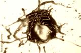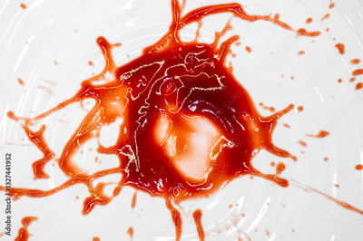 A dynamic splash of red liquid on a white surface, creating an abstract pattern. The vivid contrast highlights the energy and fluidity of the liquid.