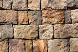 Rustic brick wall with a stone texture. Historic castle facade featuring an aged masonry pattern. Solid construction with weathered bricks and architectural stone blocks.