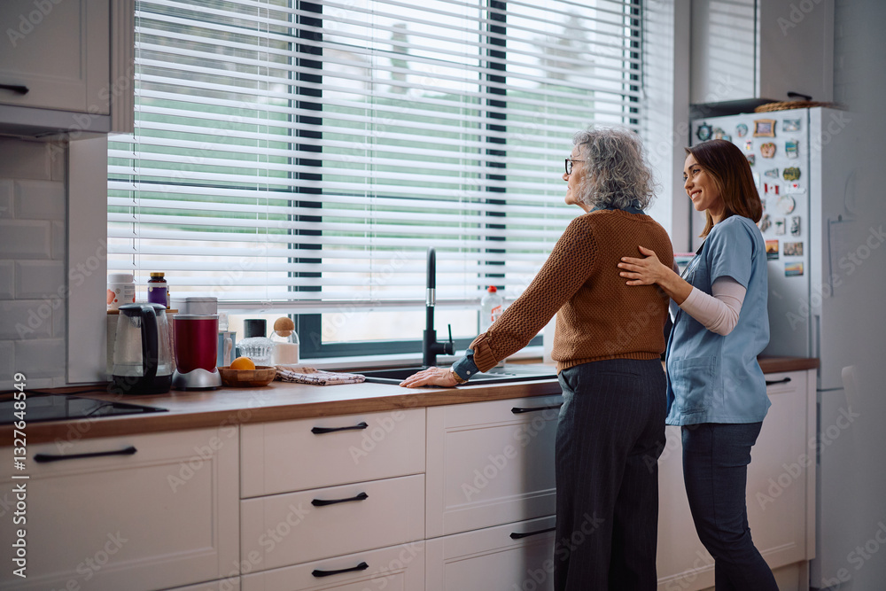 Caring nurse comforting pensive senior woman during her home visit.