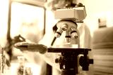 Middle-aged female laboratory worker wearing blue gloves conducts lab test on food ingredients lettuce, cucumber, pork. Using microscope, she analyzes nutrients, preservatives, food safety records.