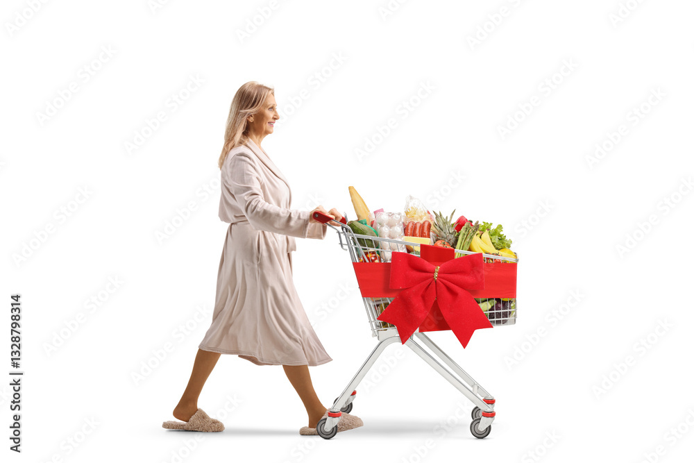 Woman in a bathrobe pushing a shopping cart with red ribbon bow and food
