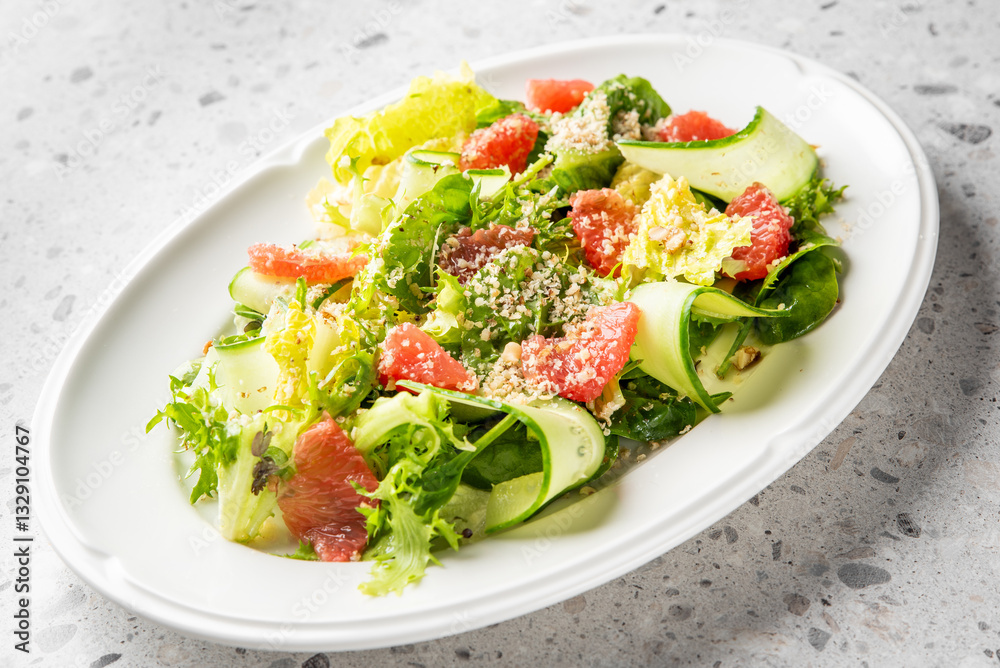 A fresh salad featuring mixed greens, grapefruit segments, and cucumber ribbons, elegantly presented on a white platter against a textured gray background.