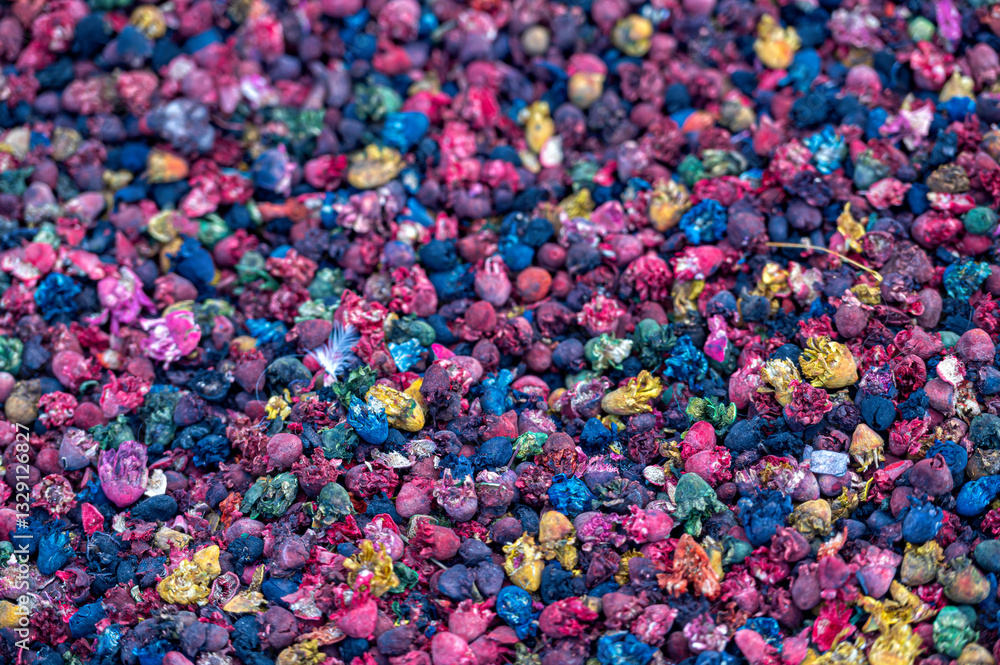 Brightly colored spices and tea blend together at a bustling Marrakech market.