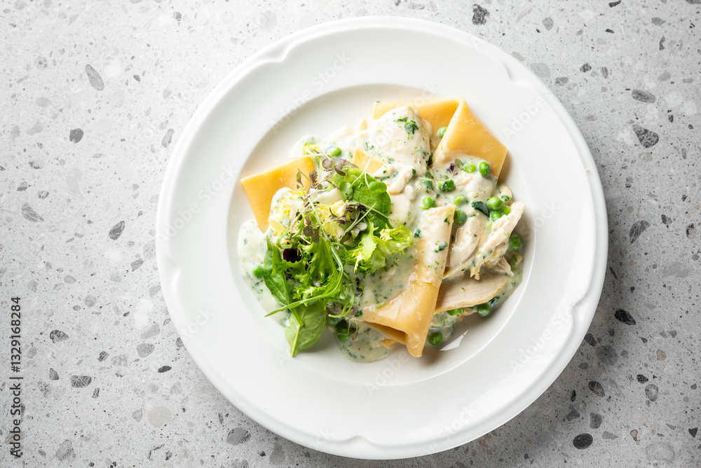 Creamy pasta with chicken, peas, and fresh greens. The dish is beautifully plated, showcasing vibrant colors and a rich sauce, perfect for a delicious meal.