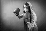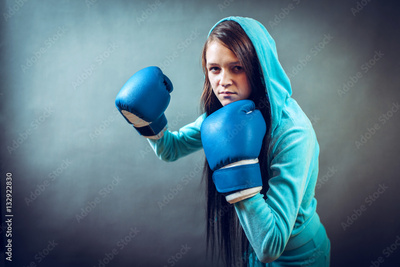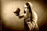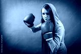 Boxer woman during boxing exercise making direct hit
