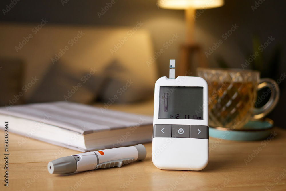 A glucometer displays blood sugar levels while a pen for testing lies nearby. A cup of tea and an open book add to the serene ambiance of the well-lit room