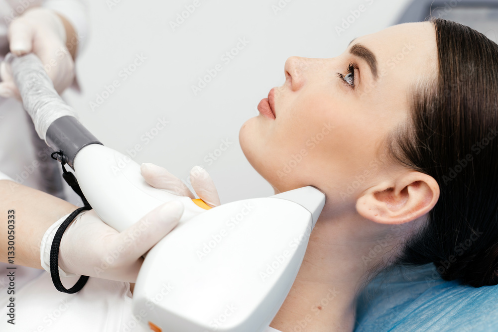 A woman enjoys a facial laser hair removal treatment in a beauty salon. Concept of advanced technology and professional skincare in a relaxing spa environment.
