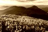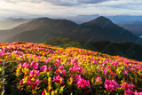 Vibrant rhododendron flowers in full bloom on a mountain slope, bathed in golden sunset light with misty peaks in the background. Landscape photography