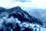 Stunning summer mountain view with green slopes covered in blooming rhododendron flowers, bathed in warm morning light with misty blue ridges beyond. Landscape photography