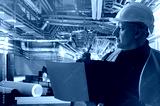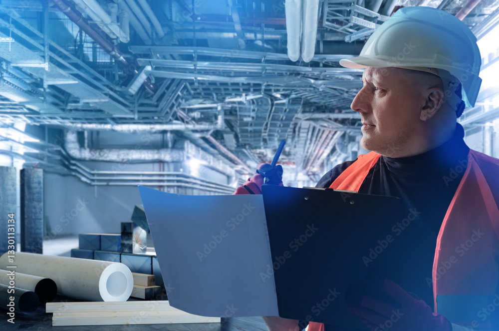 inspector in a hard hat and safety vest reviews documents in an industrial facility with overhead pipes, ducts, and materials, ensuring safety and compliance