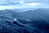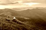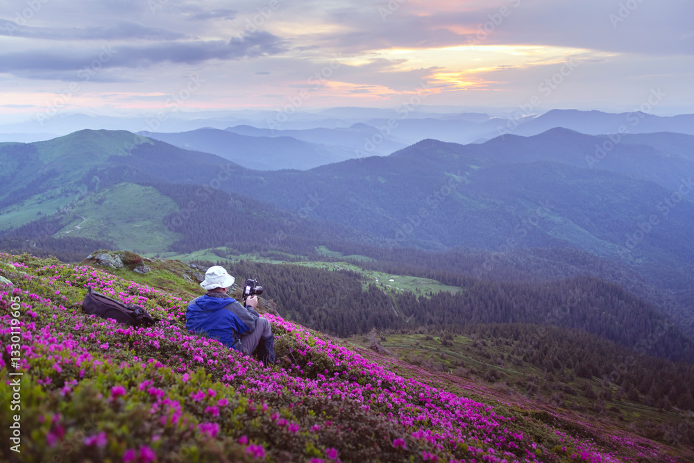 Landscape photographer taking a shot of blooming rhododendrons on a summer mountain meadow. Soft sunrise glow
