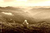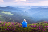 Hiker sitting on a scenic mountain ridge surrounded by blooming rhododendrons, with a stunning purple sunset and endless peaks in the background. Spring mountains. Landscape photography