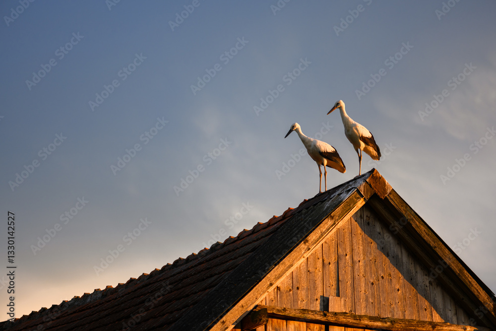 Couple of white storks resting on an old house roof with a soft, cloudy sunset in the background