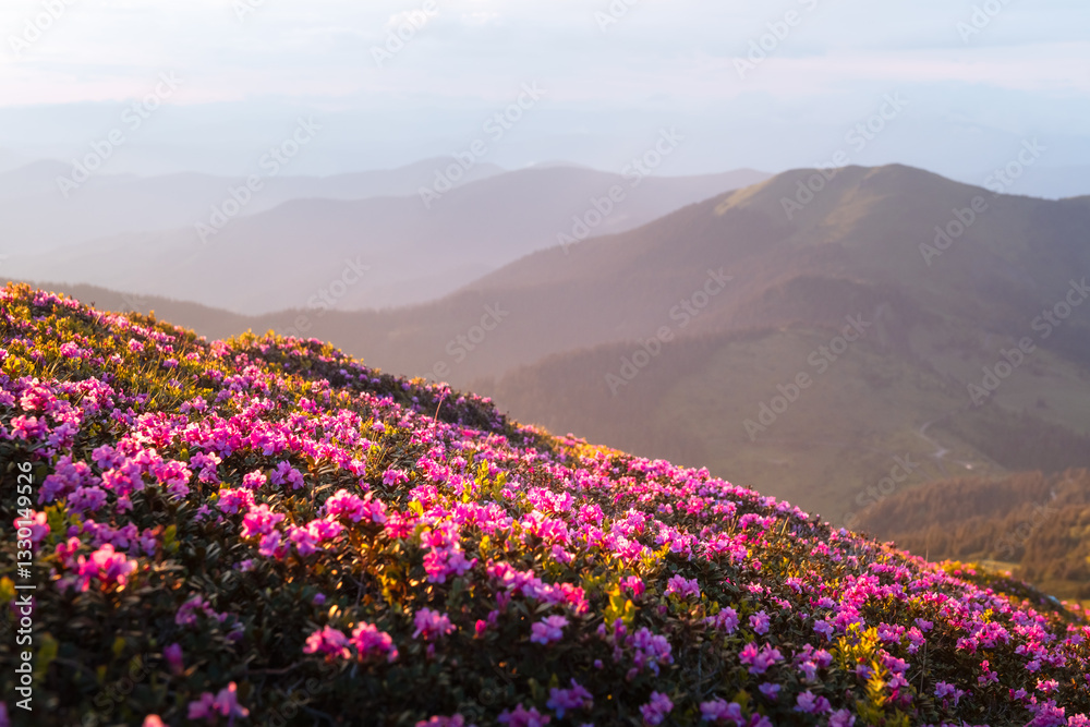 Breathtaking view of a spring mountain meadow filled with blooming rhododendrons, glowing under the warm hues of a sunset-lit sky. Spring mountains. Landscape photography