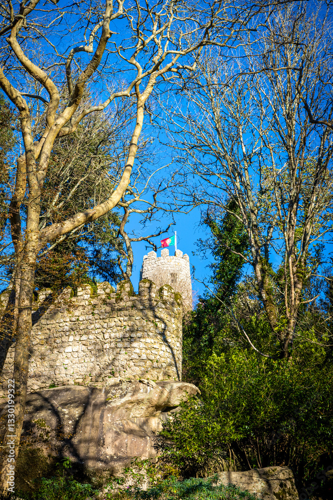 Flag of Portugal on top of the historic 10th century Moorish Castle or Castelo dos Mouros in Sintra, as seen through the woods.