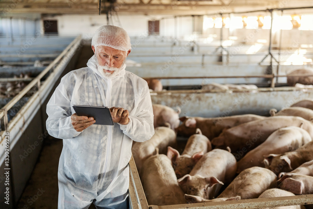 Portrait of senior farmer standing near pigs in pen and scrolling on tablet.