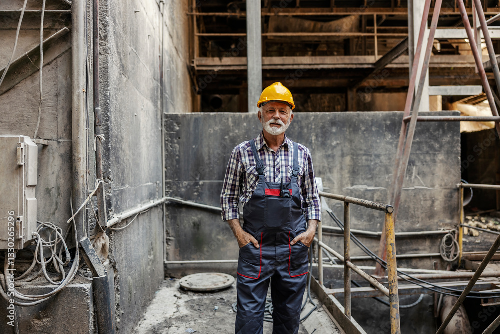 Portrait of senior industry worker standing at facility and looking at camera.