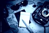 Spiral notebook with travel stuff and signing pen arranged on a map.