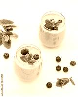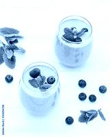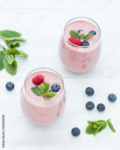 Stylish glasses of healthy smoothies with raspberry and blueberry. Morning breakfast for two. Top view