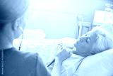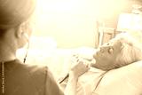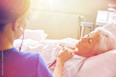 nurse with stethoscope and senior woman at clinic