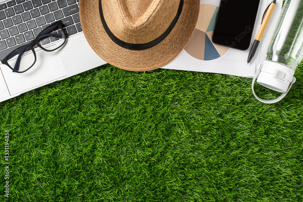 Flat lay of a laptop, straw hat, planner, and other essentials on grass background. Represents remote work, efficiency, relaxation, and a connection with nature creating an inspiring workspace