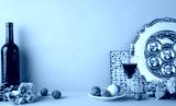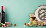 Passover side view items including a seder plate, matzot, and wine bottle arranged on green backdrop