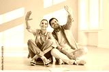 Happy young couple moving first new flat, resting seated on floor after relocation day, planning future, remodeling works, homeowners discuss repair ideas, wall color renovation, interior design
