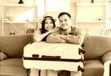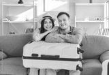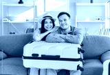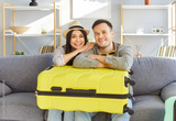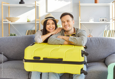 Young loving tourist couple at home, happy planning bright summer trip holiday, beach, packed luggage bag for vacation travel, things into big suitcases, family dreaming of travelling, honeymoon